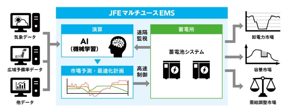 ※1 JFEマルチユースEMS(Energy Management System): 気象予測・広域予備率等のデータを用いた需要予測や市場価格予測に基づき、3つの市場(卸電力市場、需給調整市場、容量市場)への調整力・供給力の供出を最適に行える充放電計画の作成及び遠隔地にある蓄電池の高速自動制御及びリアルタイム監視を行うシステム