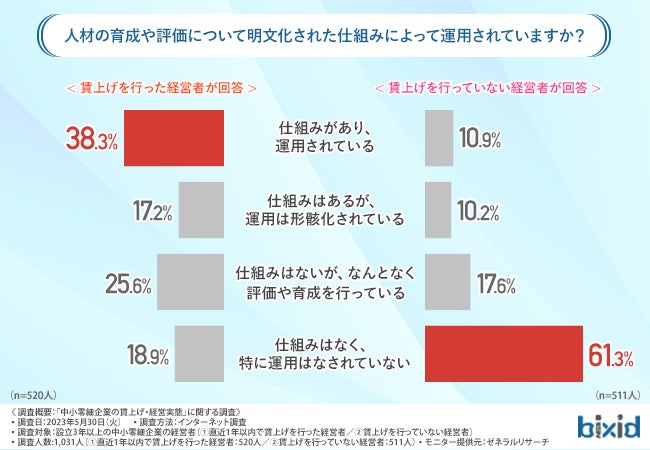 賃上げを行っていない方に、同様の質問をしたところ、『仕組みがあり、運用されている(10.9%)』『仕組みはあるが、運用は形骸化されている(10.2%)』『仕組みはないが、なんとなく評価や育成を行っている(17.6%)』『仕組みはなく、特に運用はなされていない(61.3%)』という回答結果になりました。