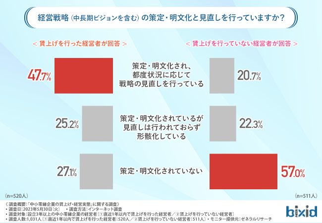 そこで、賃上げを行った方に「経営戦略(中長期ビジョンを含む)の策定・明文化と見直しを行っていますか?」と質問したところ、『策定・明文化され、都度状況に応じて戦略の見直しを行っている(47.7%)』『策定・明文化されているが見直しは行われておらず形骸化している(25.2%)』『策定・明文化されていない(27.1%)』という回答結果になりました。