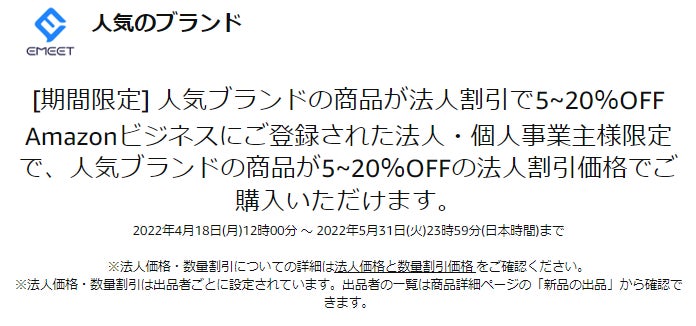 eMeet・ジャパン株式会社は、Amazonにて開催される「法人・個人事業主様限定セール」において、2022年4月18日~5月31日までスピーカーフォンやウェブカメラ等を最大20%OFFで販売致します。