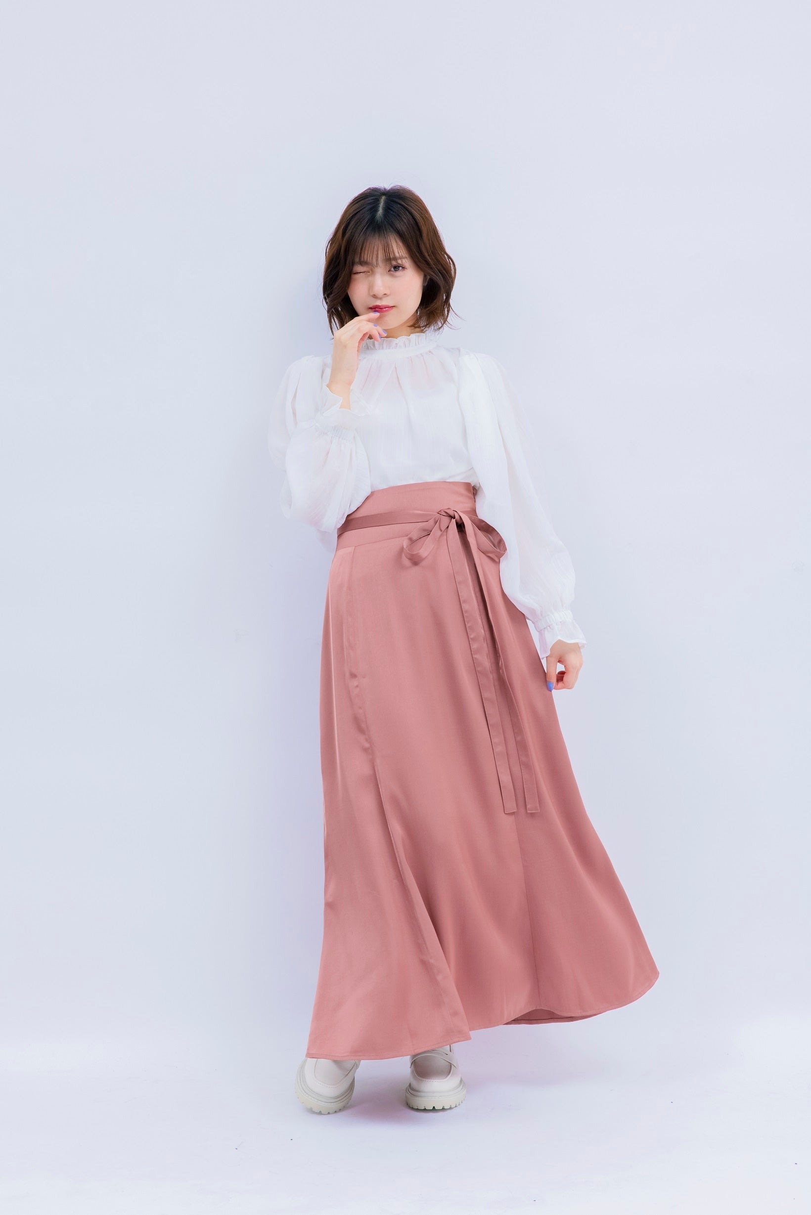 スカートはハイウエストと長めのリボンで脚長効果2倍。