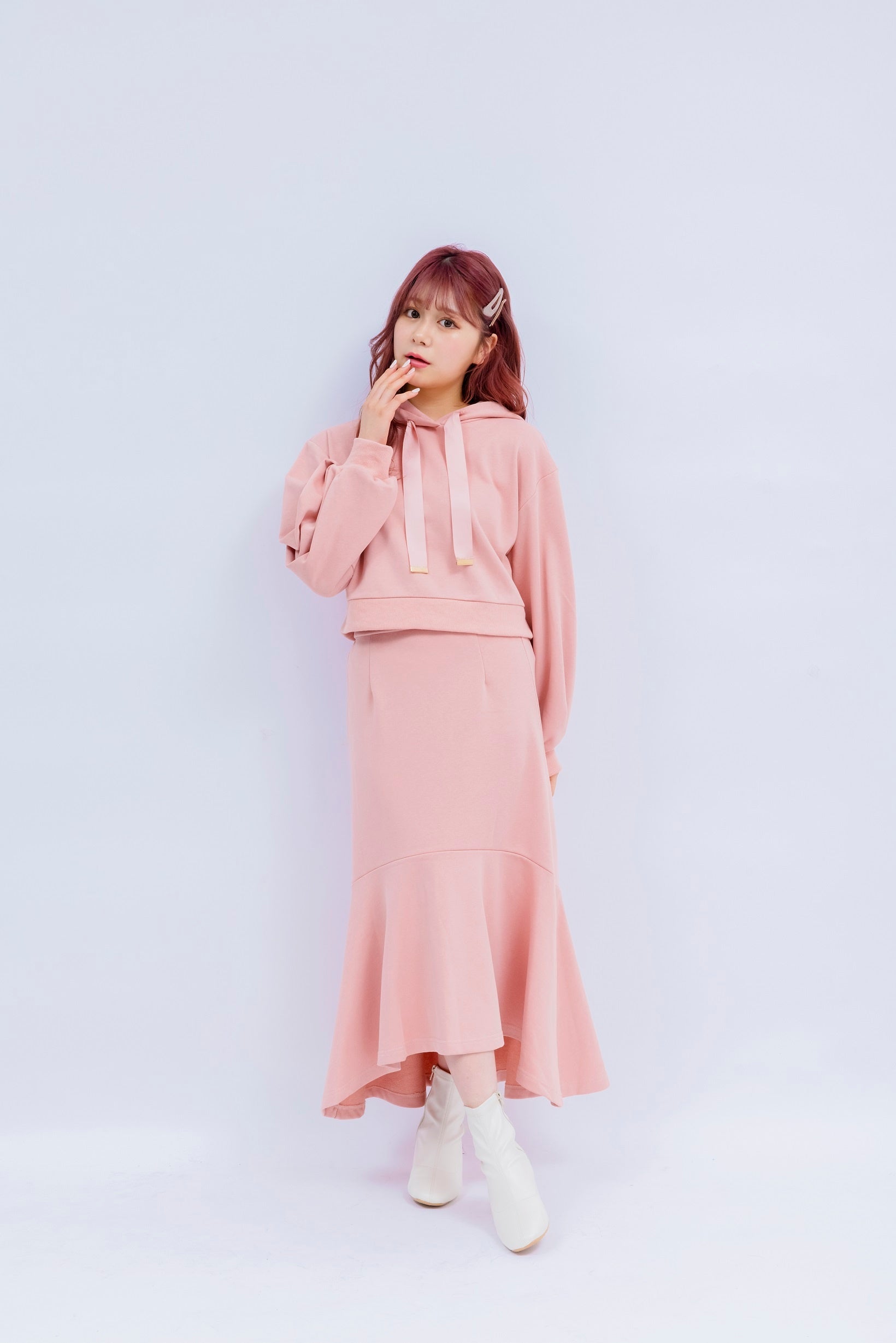 トップスのフードの紐に金具をつけたのが高見えポイント。