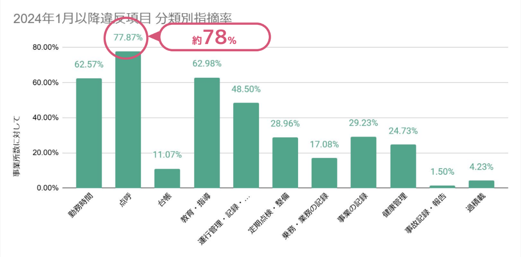 4)2024年になってからの違反内容ごとの集計では、先⽉と傾向に変化はなく、点呼に