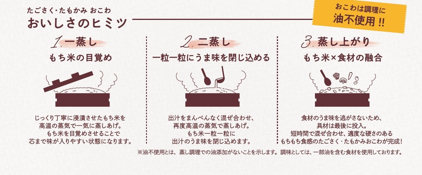 1966年に創業した「たごさく」は、日本の食を支える「田」への感謝の気持ちをブランド名に表しており、日本伝統の食文化である彩り豊かな四季の「おこわ」を時代の嗜好に合わせてお届けしてまいりました。伝統や四季を大切にし、厳選した国産もち米と海の幸・山の幸などの旬の食材を店内のせいろでじっくり蒸しあげたおこわは、「たごさく」ならではの逸品。このたび、おいしいおこわにより親しみを持って、お楽しみいただくため、人気のおこわメニューをリニューアルいたします。おこわと具材のバランスにこだわり、「おこわ」と向き合ってきた「たごさく」だからお届けできるメニューの数々です。