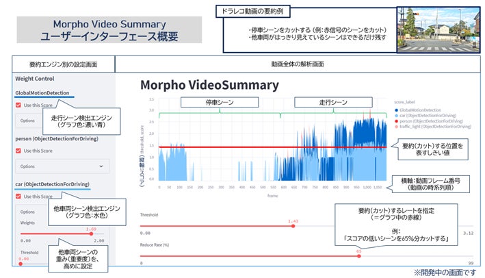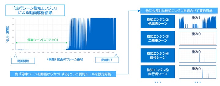 そこで『Morpho Video Summary』では、用途に合わせてユーザーが細かく要約ルールを設定するための多彩な動画解析エンジンを提供します。例えば、「走行シーン検出エンジン」は、動画の中で自車が走行中のシーンを割り出すことができます。これにより、動画の中で自車が赤信号で停車しているシーン(画面に変化の少ないシーン)をカットするという要約ルールを作成することができます。また、他の多彩な検知エンジンでの動画解析結果を組合せてエンジンごとに重み付け(優先順位付け)を行い、用途に合わせた複雑な要約ルール設定が実現可能です。