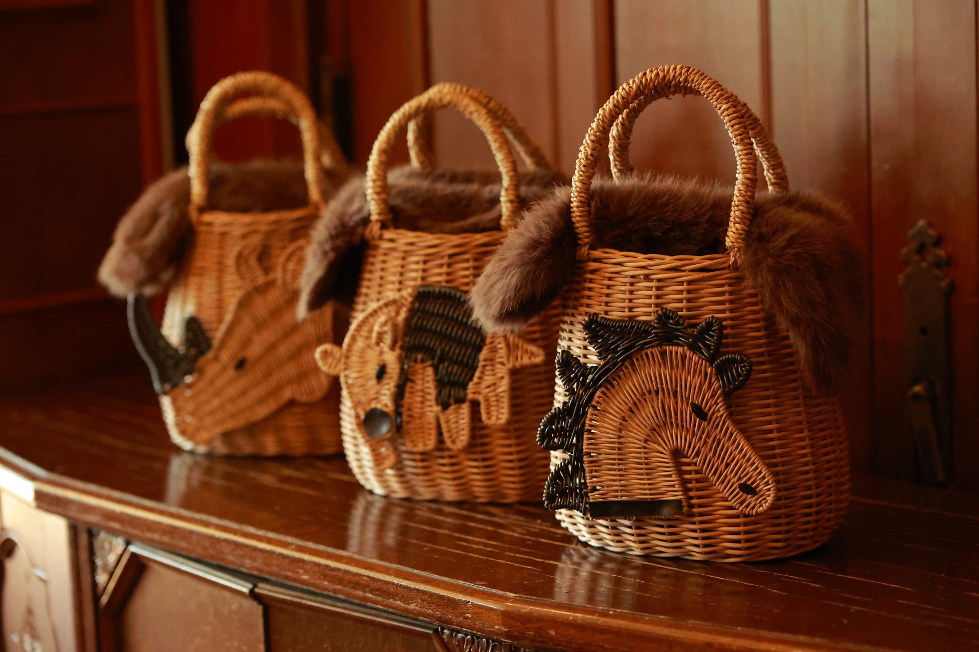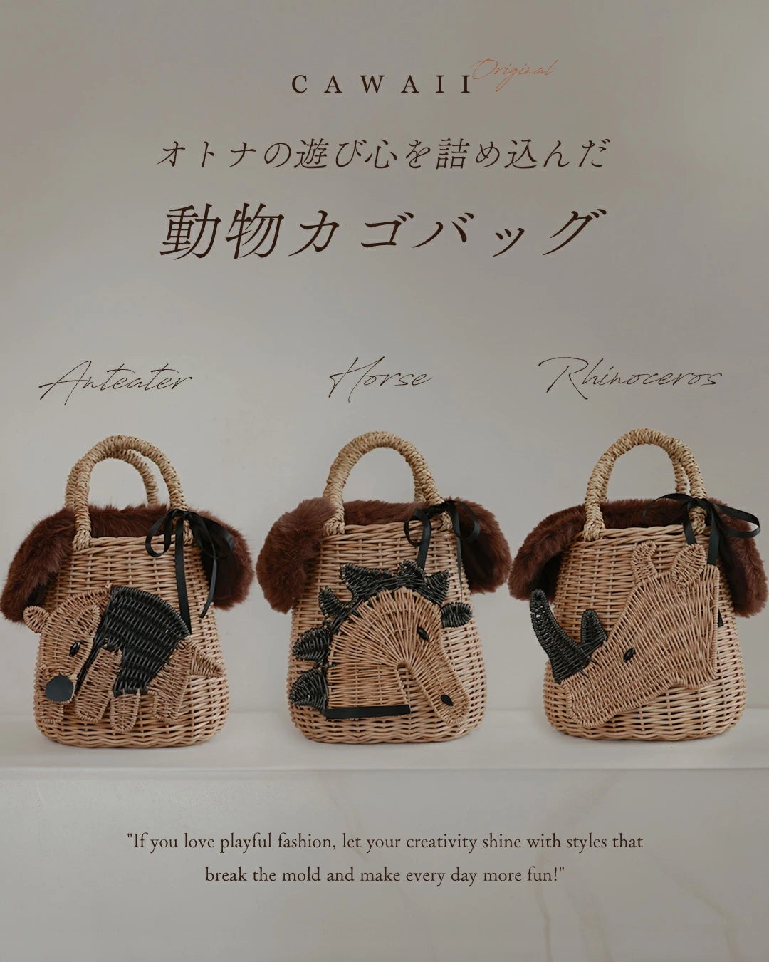 ラタンを使ったカゴバッグだから冬服にもなじみオシャレを格上げしてくれます。フェイクファーは取り外し可能なので、年中使えるのも嬉しいカゴバッグを是非この冬取り入れてみてください。また、今回のモチーフである「アリクイ」「サイ」「ウマ」は縁起がいい動物とも言われていますので、このカゴバッグ持っていれば幸運を運んでくれるかも。