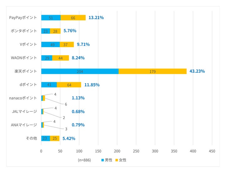 「楽天ポイント」が圧倒的に多く、全体の43.2%を占めました。特に男女ともに利用者が多く、楽天市場や関連サービスの普及がうかがえます。次いで「PayPayポイント」(13.2%)や「dポイント」(11.9%)が続き、キャッシュレス決済や日常の買い物で貯められるポイントが支持されていることがわかります。一方、「ポンタポイント」(5.8%)や「WAONポイント」(8.2%)の利用者も一定数いるものの、「nanacoポイント」(1.1%)や「マイレージ」(JAL 0.7%、ANA 0.8%)は少数派でした。この結果から、シニア層には幅広いサービスで使いやすいポイントや、普段の買い物で貯められるポイントが好まれる傾向があるようです。