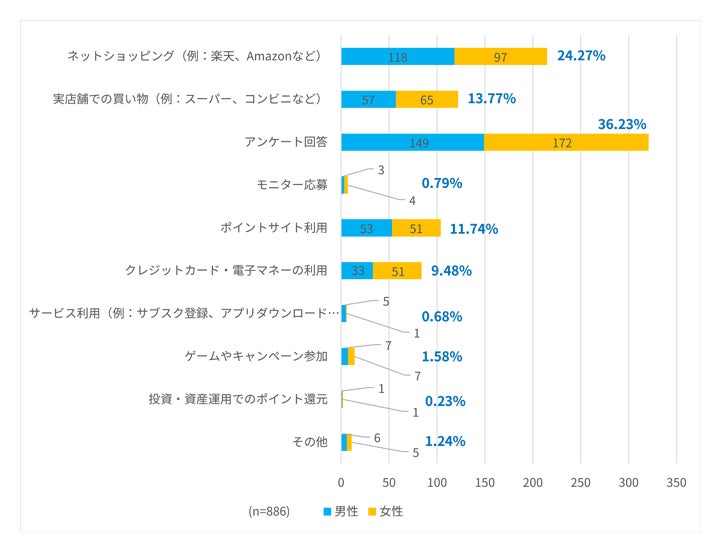 最も多かったのは「アンケート回答」で、全体の36.2%を占めました。男女問わず、アンケートを活用してポイントを貯める人が多いようです。次いで「ネットショッピング」(24.3%)が多く、楽天やAmazon、Yahoo!ショッピングなどの利用がシニア層にも広がっていることがわかります。「実店舗での買い物」(13.8%)も一定の割合を占めましたが、その他の方法は1割以下にとどまりました。特に「モニター応募」や「投資・資産運用でのポイント還元」を選んだ人はごく少数でした。これらの結果から、シニア層には手軽で取り組みやすい方法が支持されていることがわかります。