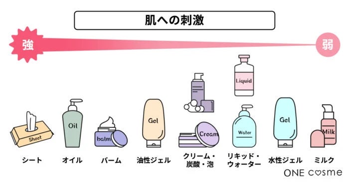 シート・オイル・バームは比較的刺激が大きく、ミルク・水性ジェル・リキッド/ウォーターは比較的刺激が小さいタイプです。