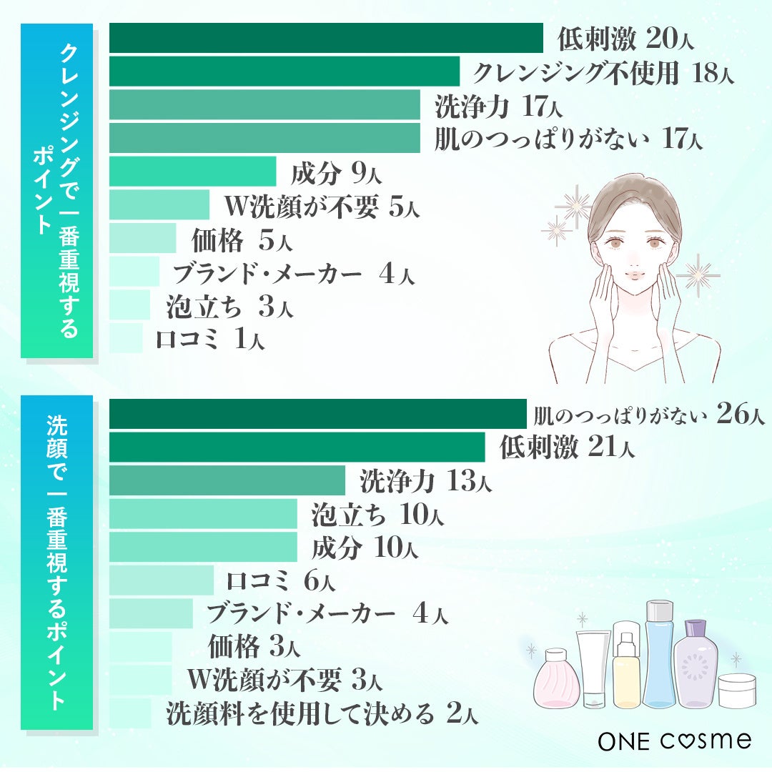 クレンジング選びでは「低刺激」、洗顔料選びでは「肌のつっぱりがないこと」を重視する人が多く、肌への負担や刺激を気にする傾向がうかがえます。