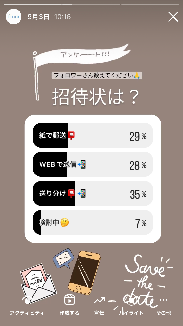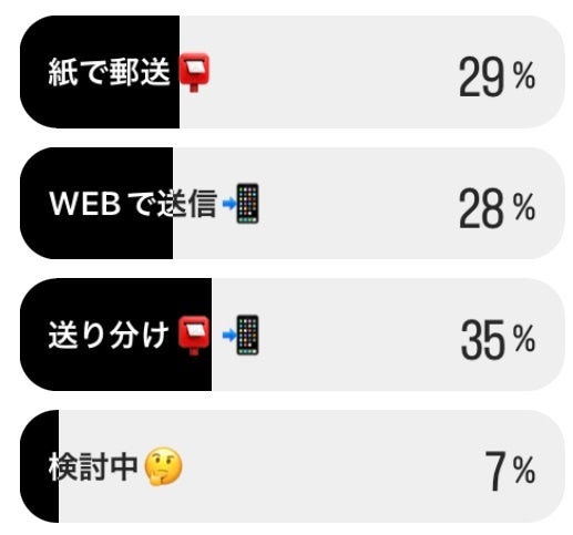 fitauは、公式Instagramを通じて、招待状の送付方法についてフォロワーへ対しアンケート調査を実施。その結果、「紙で郵送」が29%、「WEBで送信」が28%、「送り分け」が35%、「検討中」が7%という結果となりました(アンケート実施:2023年9月 回答者数:501名)。