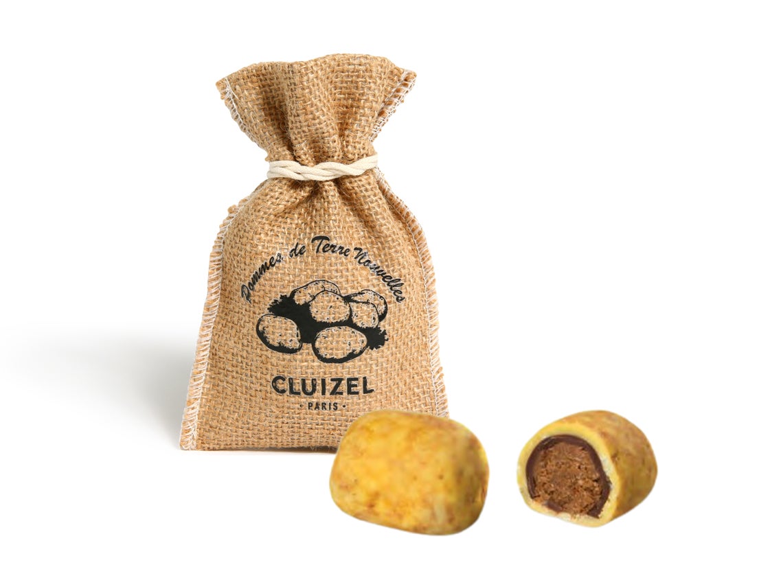 詳細:まるで本物のじゃがいもを再現したようなユーモアあふれるショコラ。表面のホワイトショコラの中に、ダークショコラの層を重ね、中心部のフィリングの中には薄く焼いたクレープ生地をしのばせました。シャリシャリとした独特の食感がクセになります。