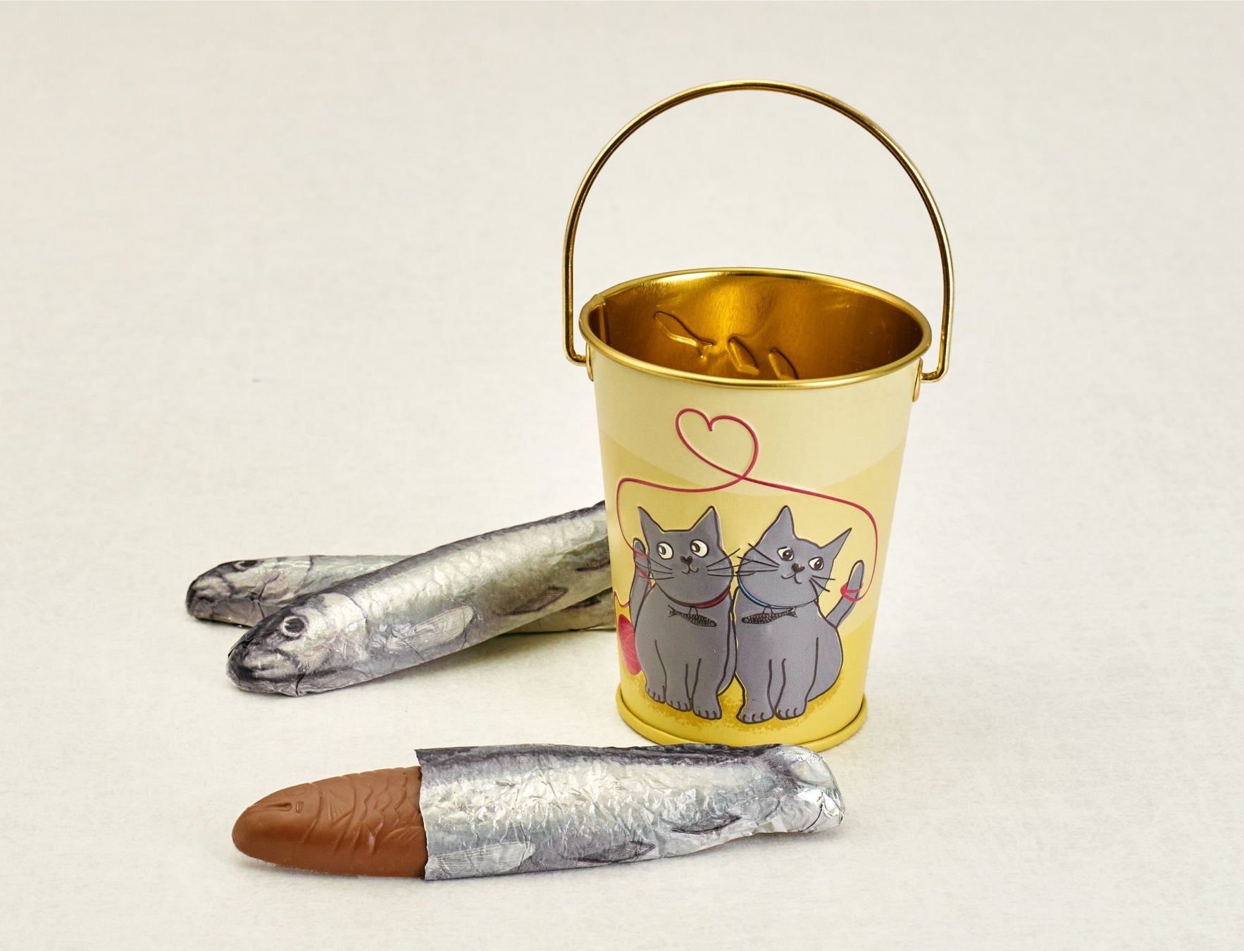 詳細:本物そっくりのサーディンのホイルショコラがユニークな「シャルトリュー・エ・サーディン」シリーズにオンラインショップ限定商品が登場。ミルクとダーク各2本ずつ、合計4本のサーディンショコラが”国の宝“とも呼ばれるフランス原産のネコ(シャルトリュー)が描かれたバケツ缶にセットされています。黄色の缶はオンラインショップ限定カラーです。