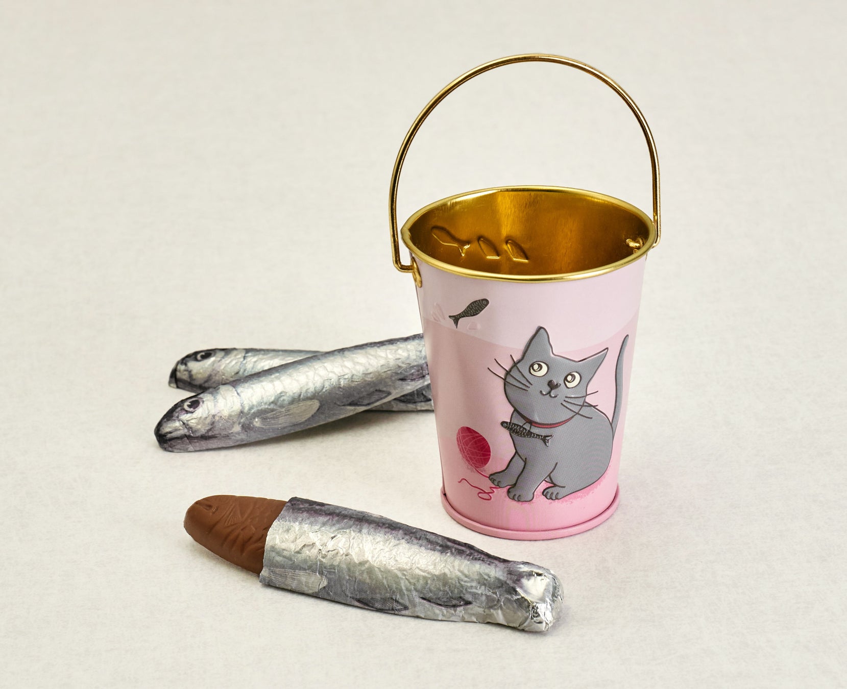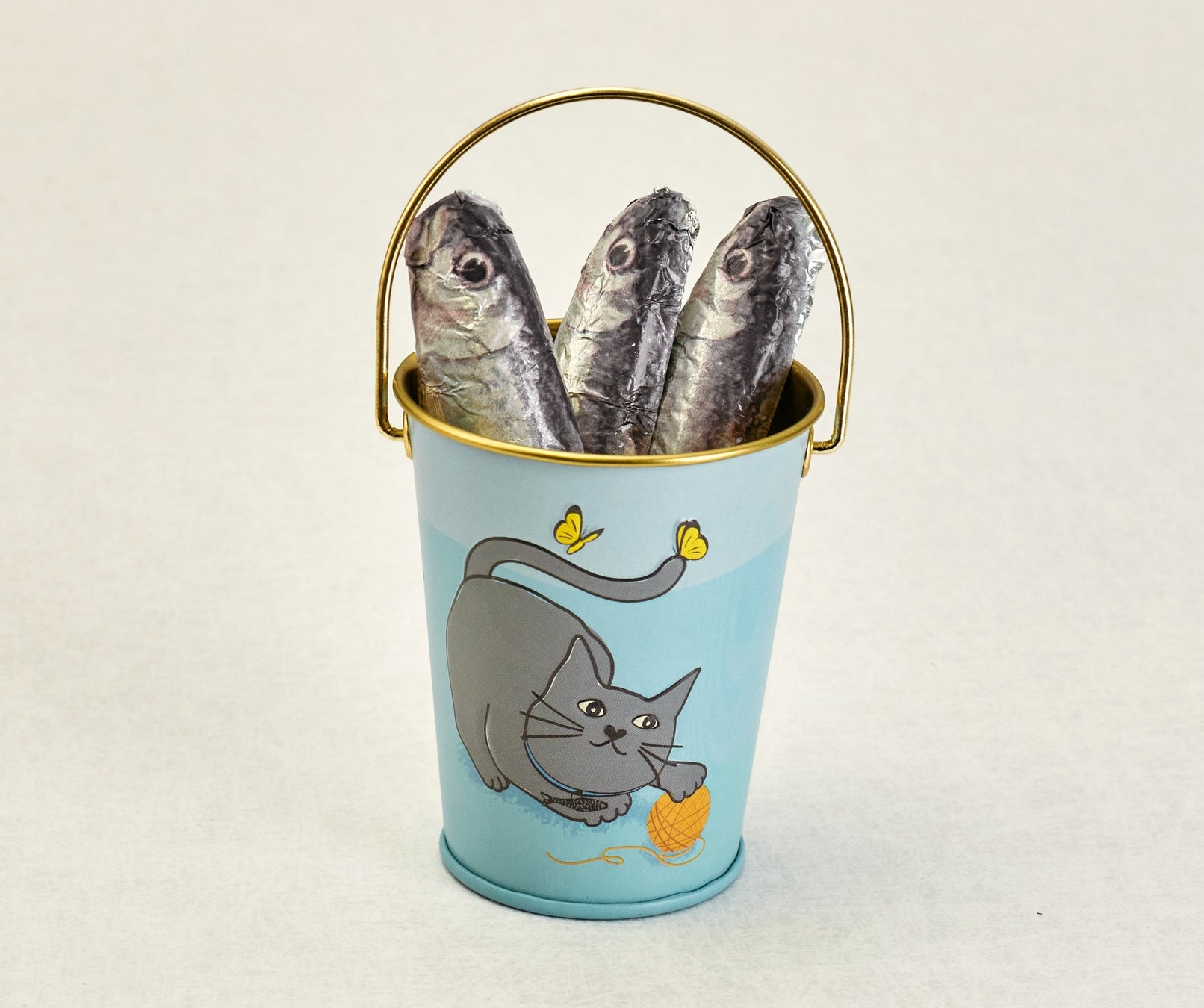 詳細:本物そっくりのサーディンがデザインされたホイルショコラ3本を、”国の宝“とも呼ばれるフランス原産のネコ(シャルトリュー)が描かれたバケツ缶にセット。ピンクの缶にはミルクショコラ、ブルーの缶にはダークショコラがそれぞれ3本ずつ入っています。