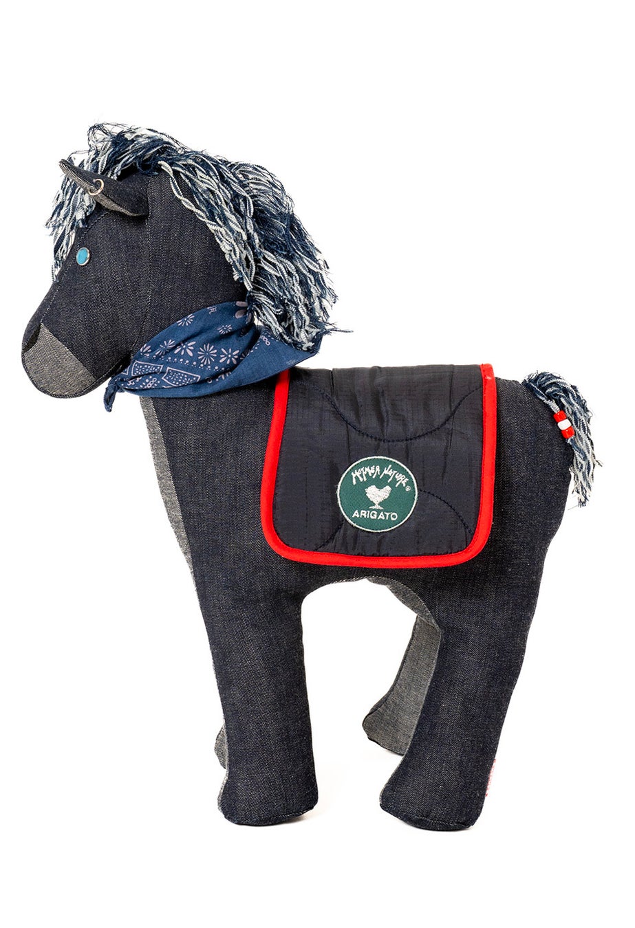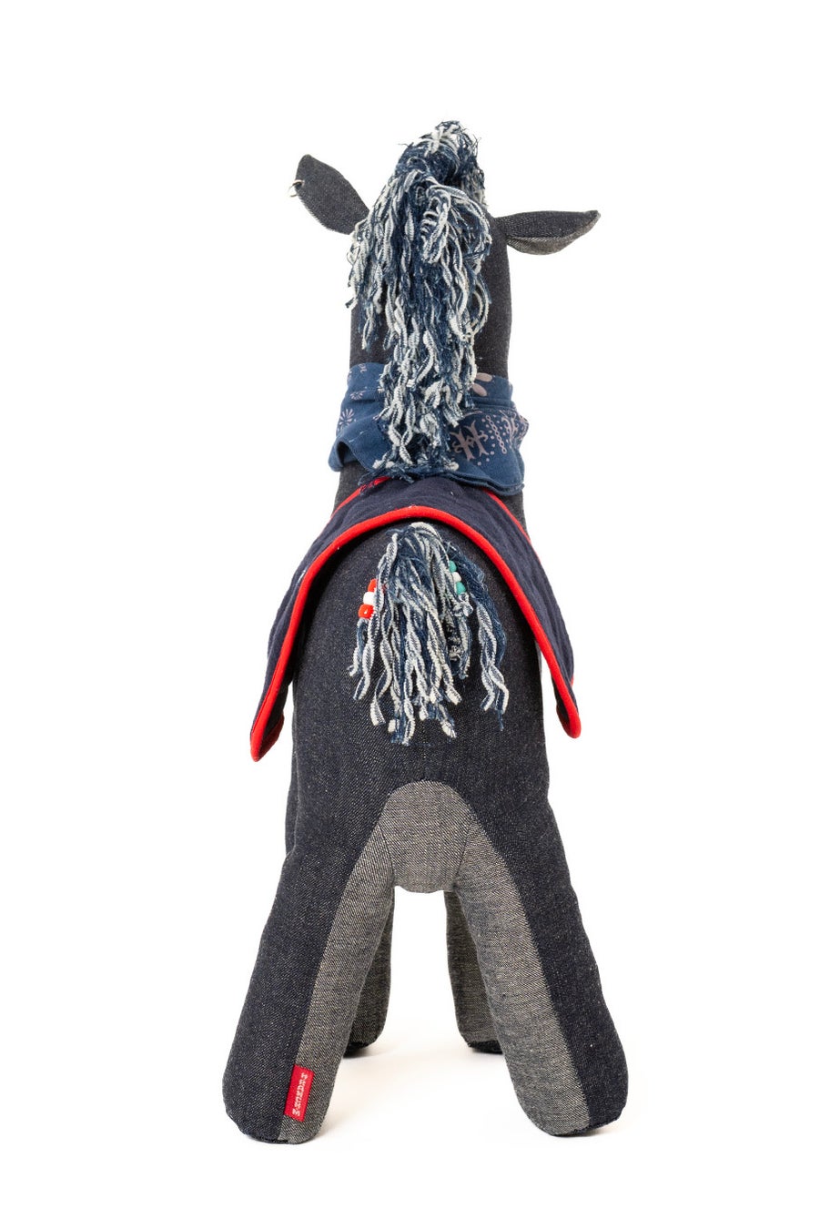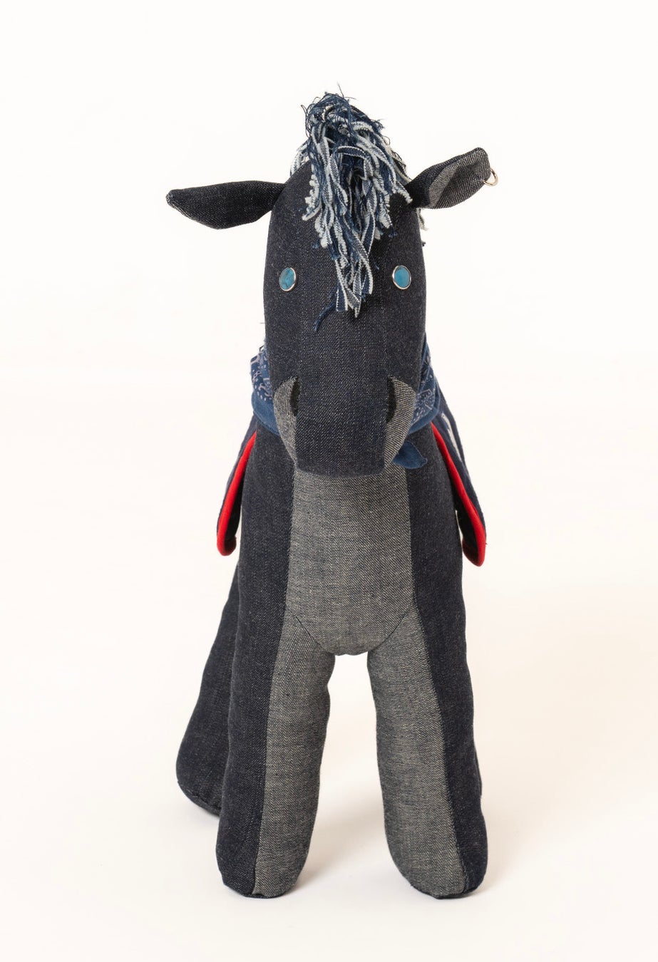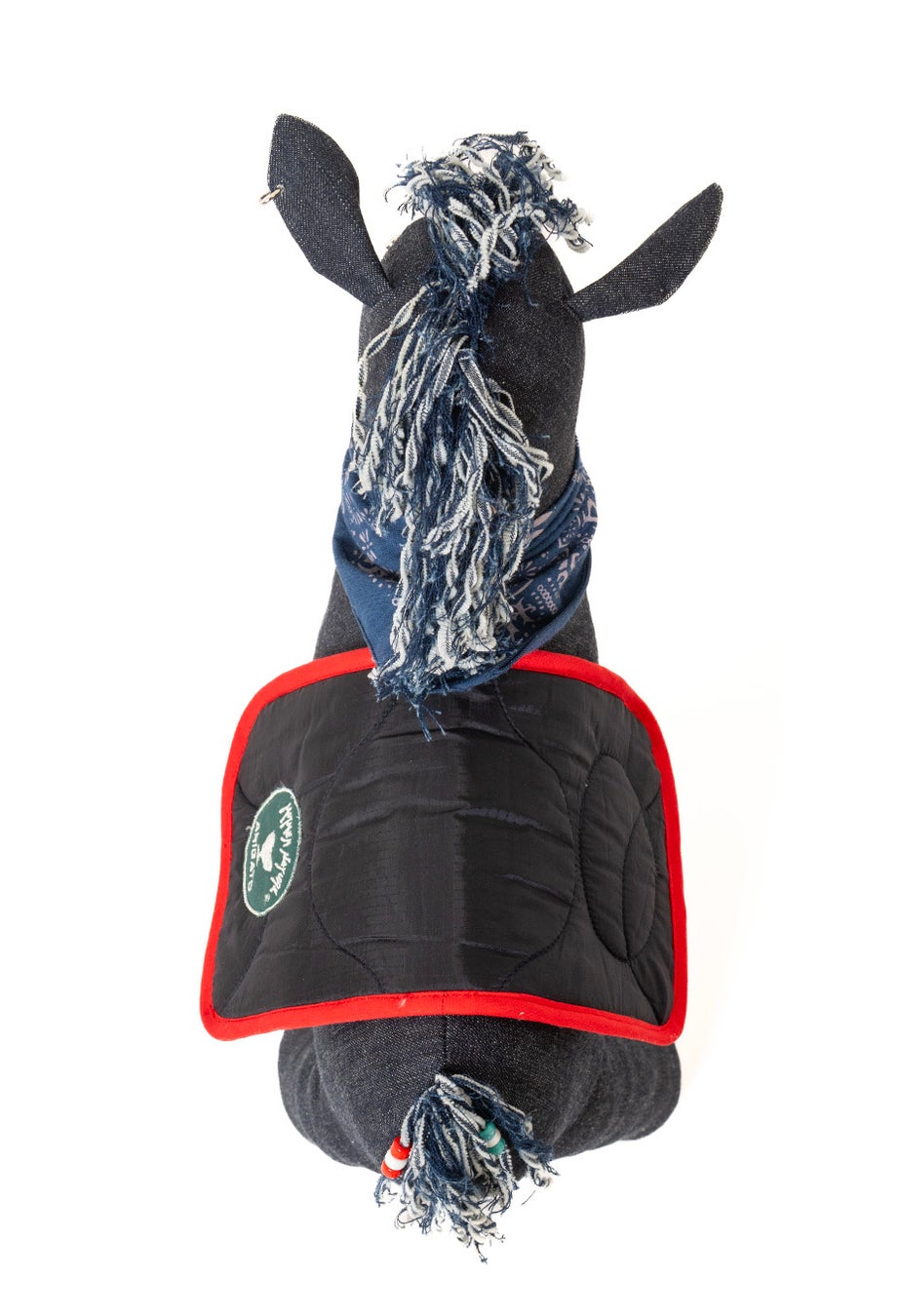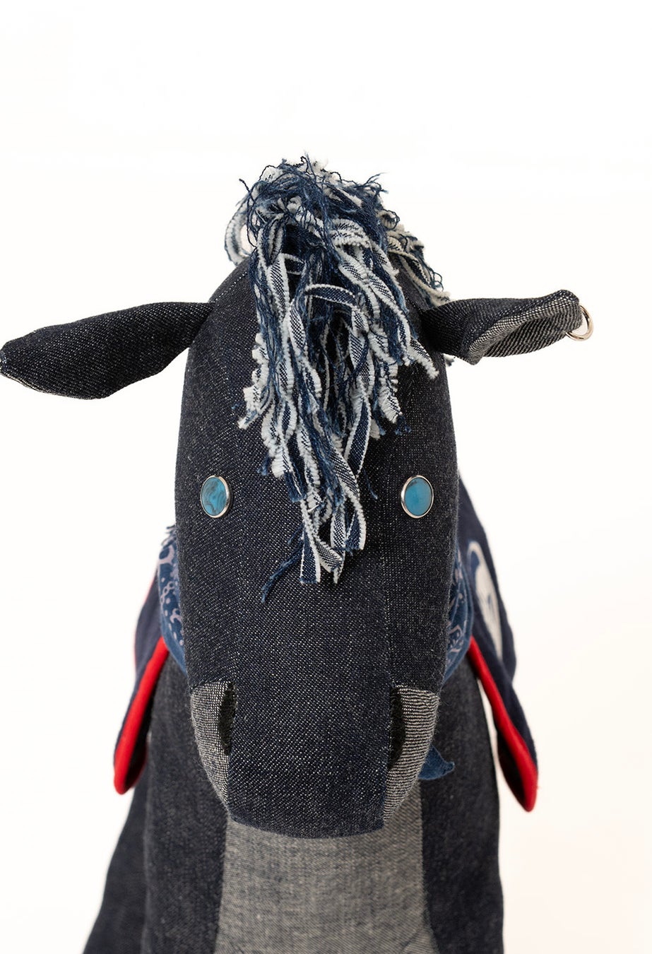 タテガミと尻尾には残布を裂いて立体的な表情を加え、目にはウエスタンシャツに使われるターコイズのパールドットボタンを採用いたしました。