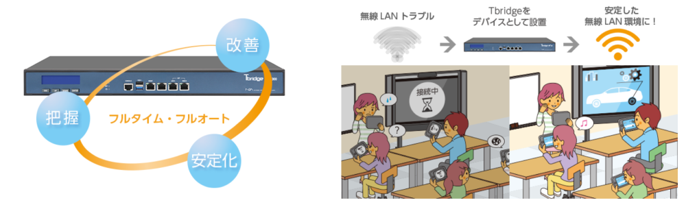 当社が2014年から販売している『Tbridge®』は、PCやタブレットなど複数の端末からデジタルコンテンツに同時接続する際に発生しやすい「遅い」「よく切れる」「つながらない」といった問題を可視化し、原因を制御することで遅延要因を解消するソリューションです。1人1台環境に対応した校内LANを実現し、授業運営を円滑にする『Tbridge®』は、学校や自治体などのユーザーに評価されています。これまでに累計出荷台数は2,000台以上、国内の約10%の自治体の教育委員会(約170自治体、約2,000校)でご利用いただいております。