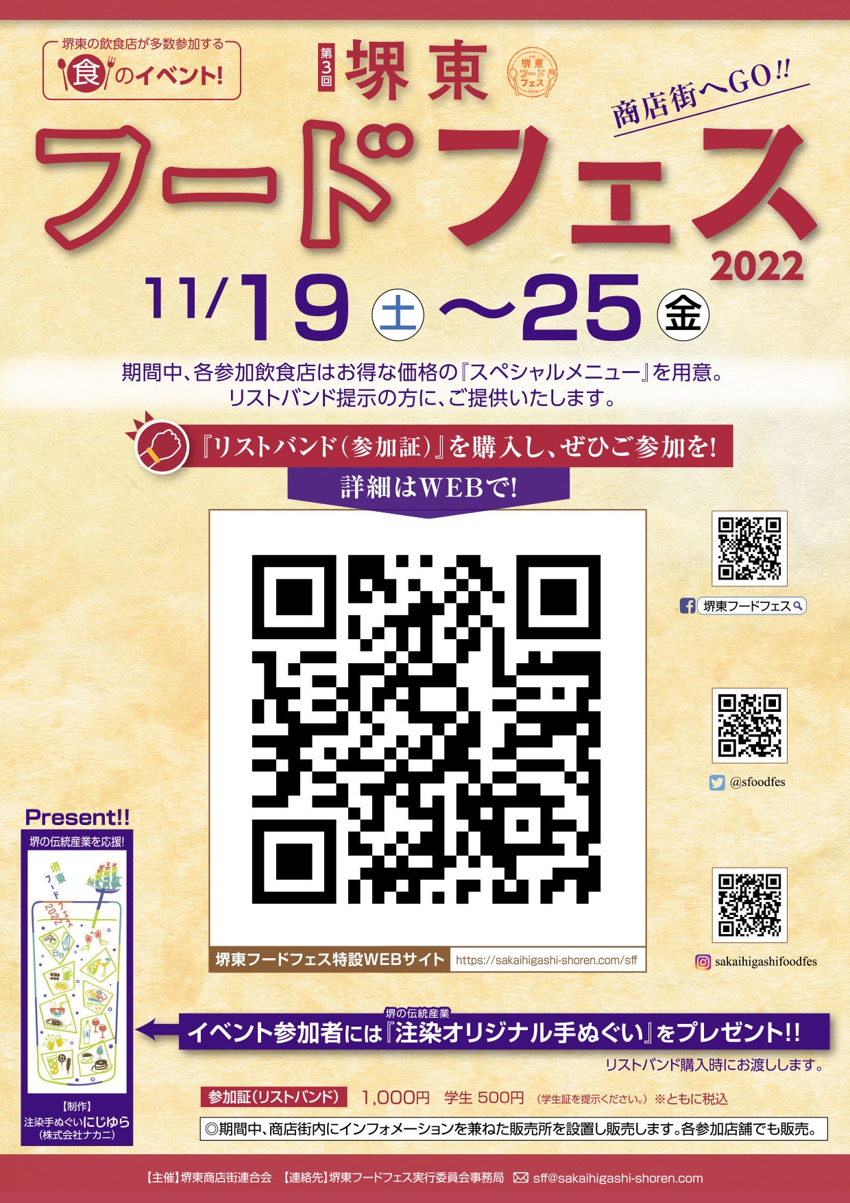 大阪府内で大阪市に次ぐ人口規模を誇る堺市。その堺市の玄関口で飲食店を中心に約400店舗が集積する堺東商店街連合会では、食のまち堺東をPRする「堺東フードフェス2022」を11月19日(土)から25日(金)までの7日間開催します。