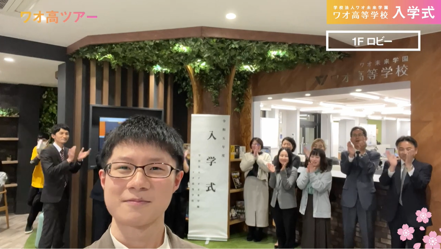 岡山にある本校を、ワオ高生と教員が、ありのままの自然な形でツアーガイドを行いました。ワオ高校の学びの種となるエントランスのナレッジツリーからスタート。漫画本まで豊富に揃った図書館、化学の実験を行う理科室・家庭科室・工作ルーム、体育室、そして20名から90名まで共に学べる教室と、新設の美しい学舎を、ウェルカムメッセージと共に案内しました。また、情報経営イノベーション専門職大学(iU)にある東京キャンパスからも、ライブ中継で、お祝いのメッセージを届けました。