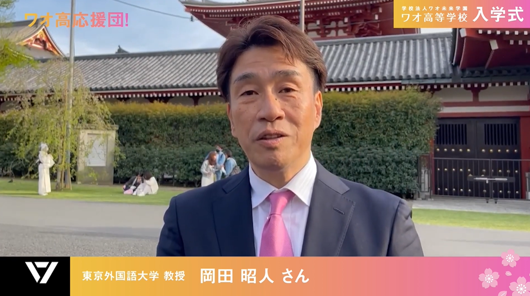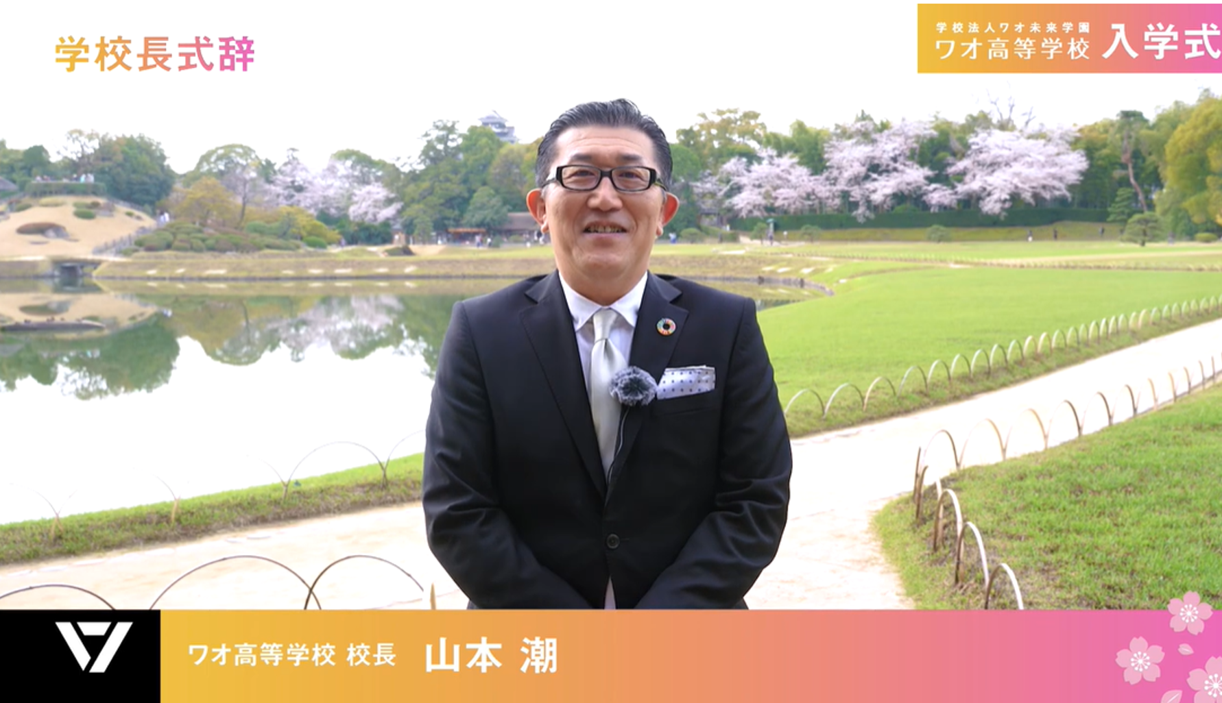 世界に誇る文化財、日本三名園の一つ、岡山後楽園の美しい桜をバックに、ワオ高校学校長 山本潮より、お祝いのメッセージとして、新入生に次の3つの言葉を届けました。
