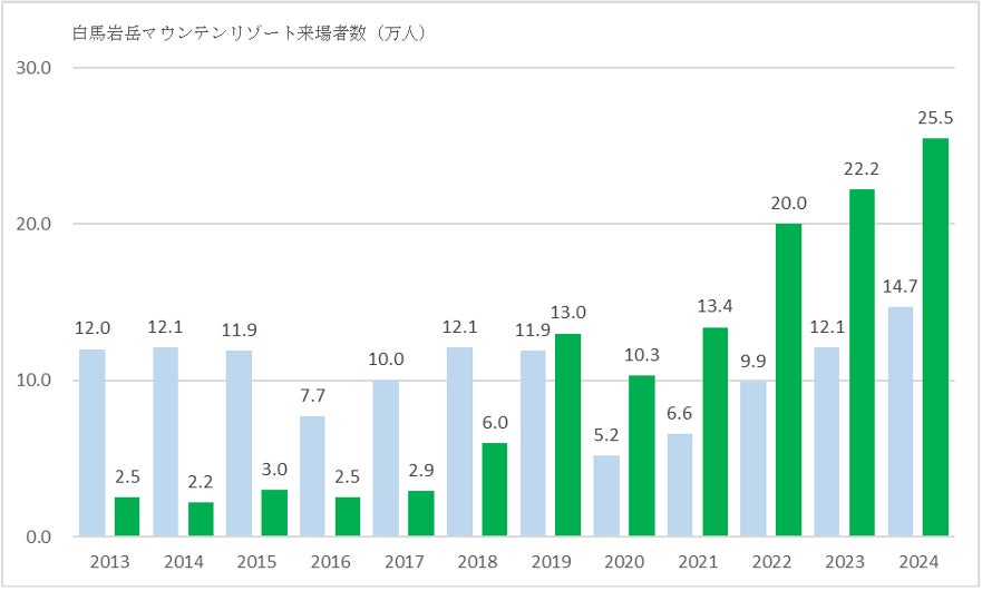 これまでの最高記録であった2023年の来場者数約22.2万人からおよそ3.3万人の伸びとなり、4期連続で過去最高を更新しました。「世界水準のオールシーズンマウンテンリゾート」に向けて動き出す前の2016年(来場者数約2万5千人)と比較すると約10倍となります。