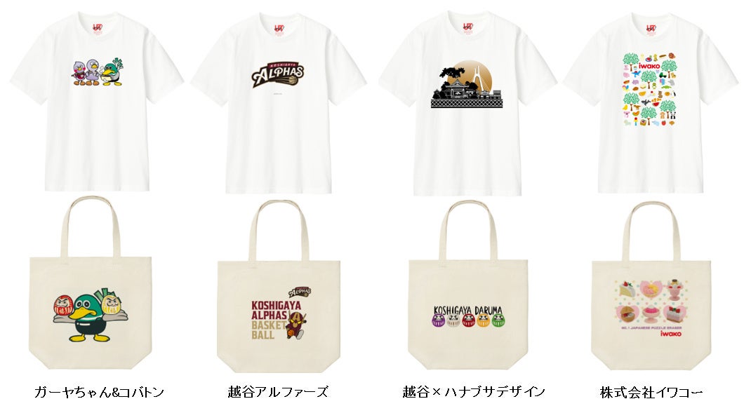 越谷市のマスコット「ガーヤちゃん」と埼玉県のマスコット「コバトン」や、越谷市をホームタウンとして活動するBリーグ所属のプロバスケットボールチーム「越谷アルファーズ」、越谷で活動する「ハナブサデザイン」と、おもしろ消しゴム製造の「株式会社イワコー」とコラボレーションしたオリジナルTシャツ(S~XL・1,990円)、およびトートバッグS(1,990円)、トートバッグL(2,490円)を販売します。