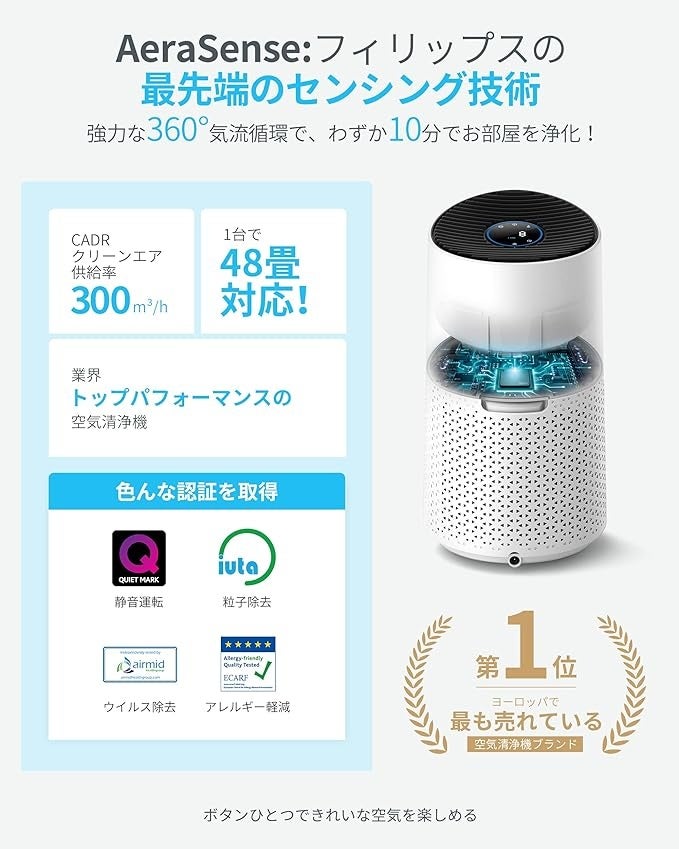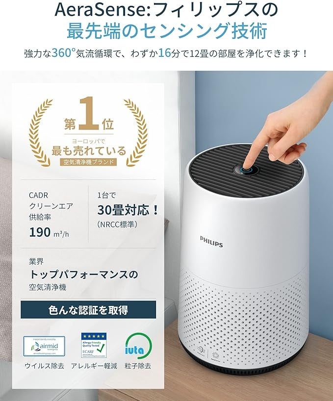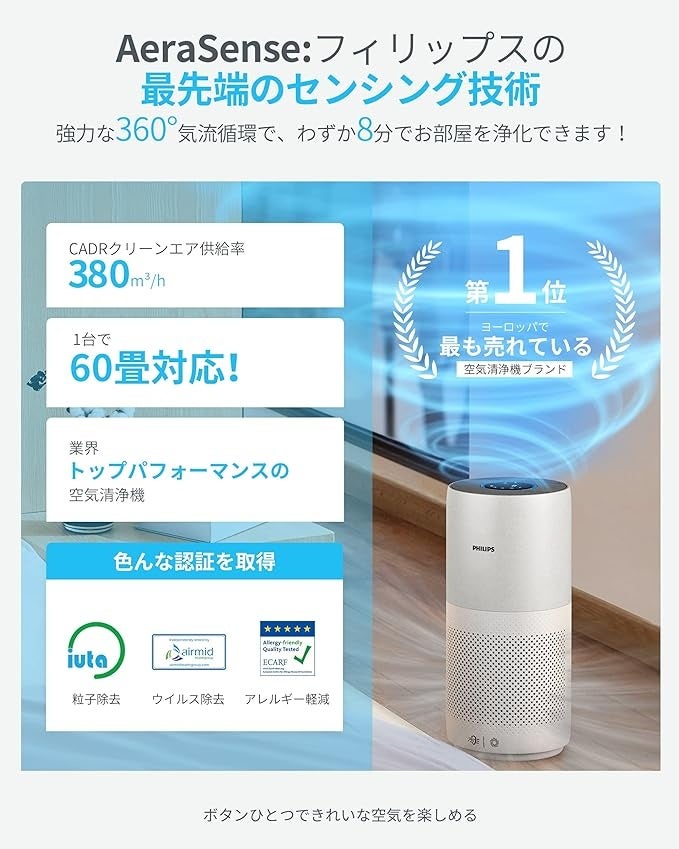 フィリップス独自の最先端技术AeraSenseC、家の空気を素早く浄化。