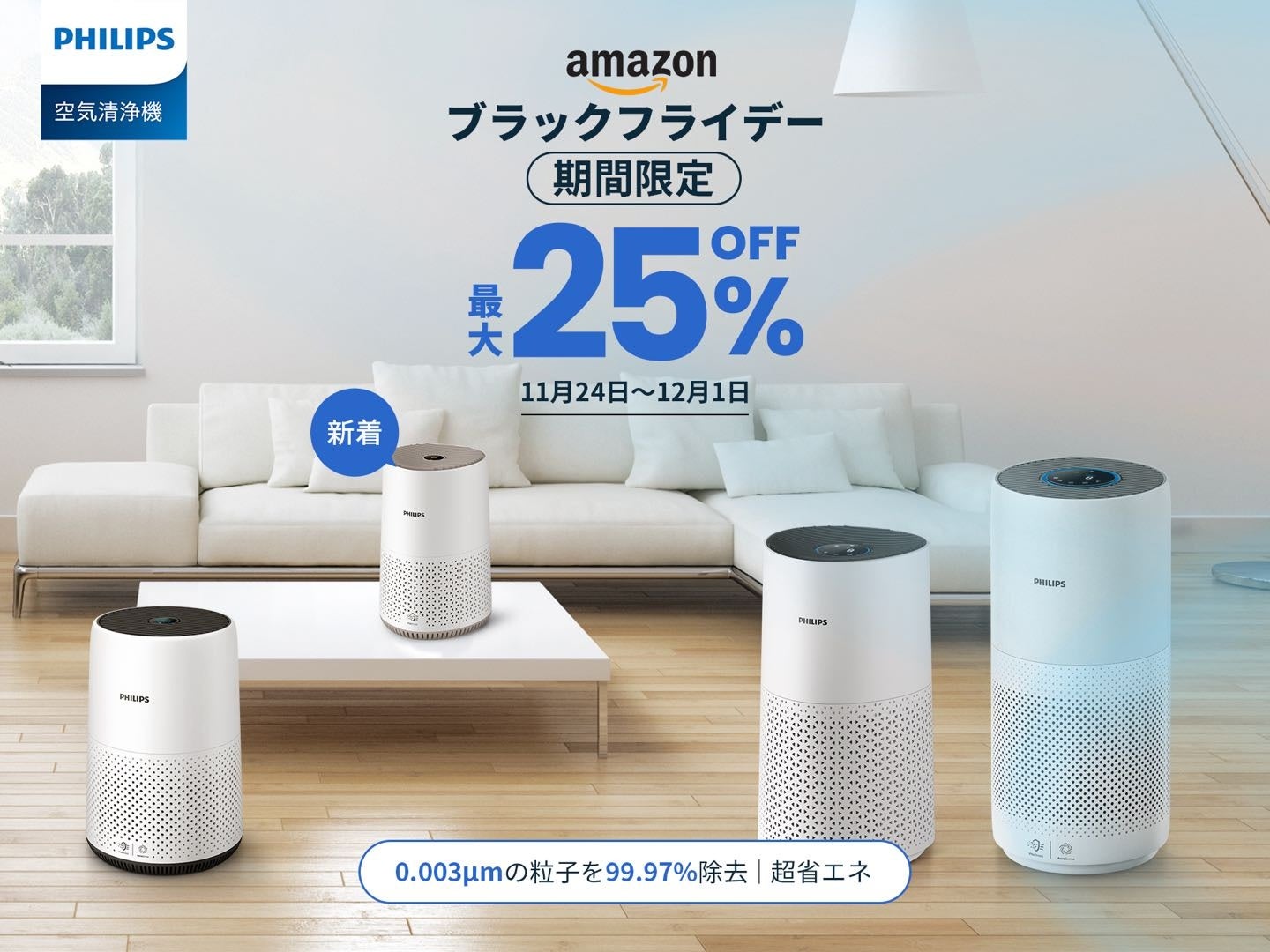 フィリップスxAmazonブラックフライデー開催!11月24日 (金) 0:00~12月1日 (金) 23:59まで、フィリップスの空気清浄機は最大25%OFF。今回のチャンスをお見逃しなく!