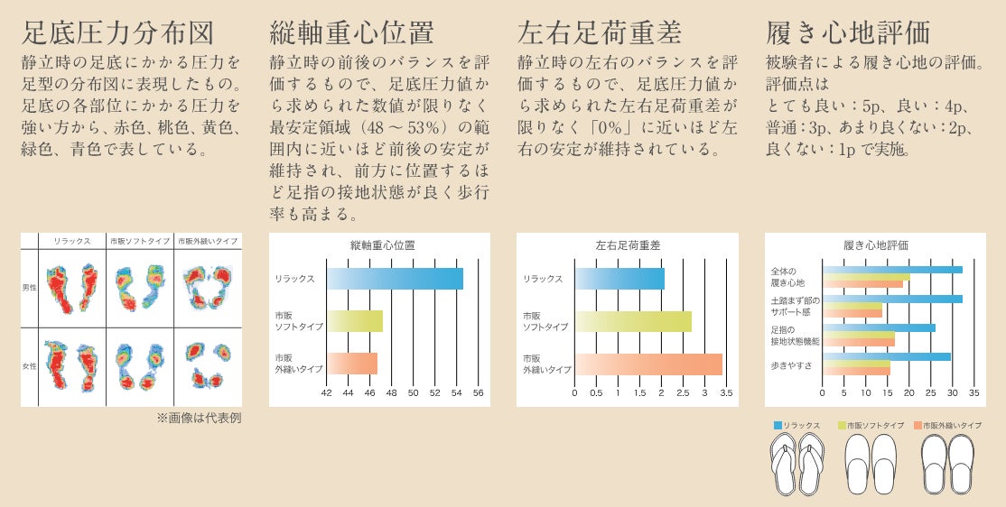 足底圧力分布、縦軸重心位置、左右足荷重差、着用感などを検証し開発しました。