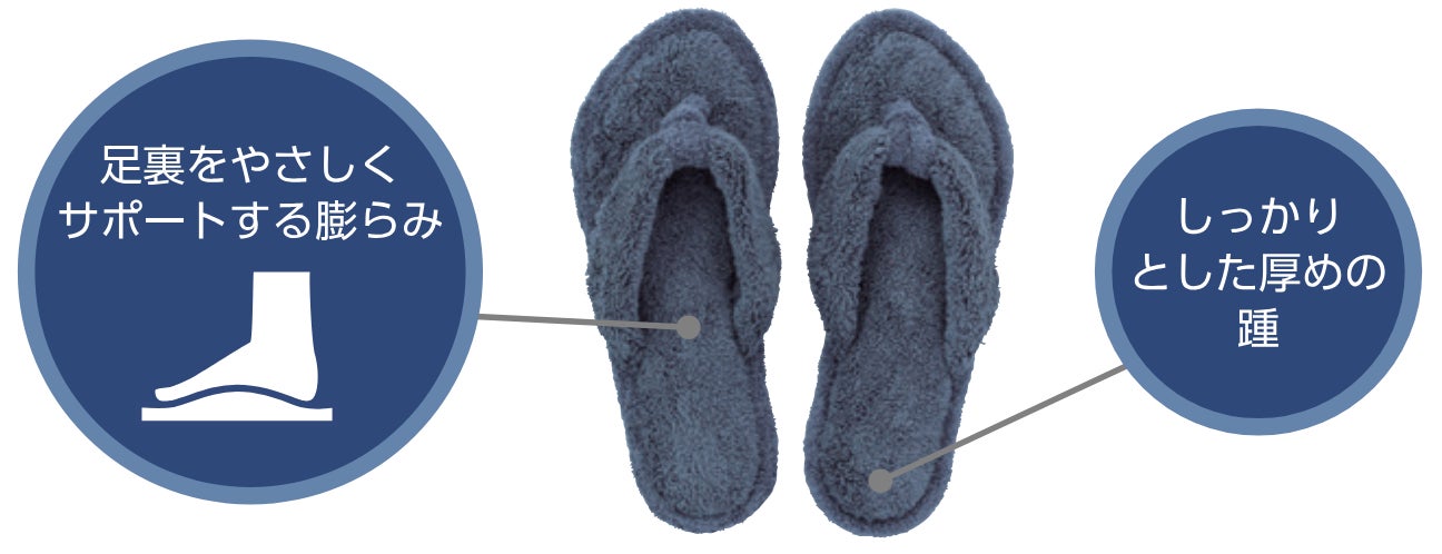 特にサンダル型のスリッパは母趾と第2趾で鼻緒を挟んで履くため、自然と足首から足裏まで使って歩く動作となり、足の運動量が増し筋肉が鍛えられ、歩行姿勢やバランスを整える効果が期待できます。