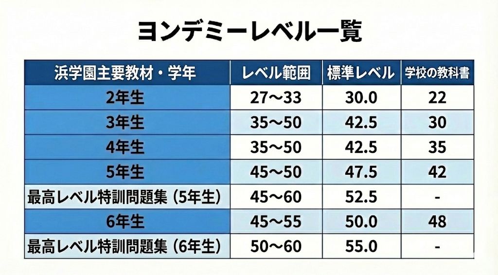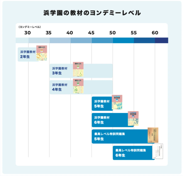 浜学園のテキストは、受験本番に求められるレベルを踏まえて段階的に設計されています。そのため、学校の教科書と比べて文章の難易度が高くなっています。「ヨンデミーレベル」で比較すると、その差は明らかです。