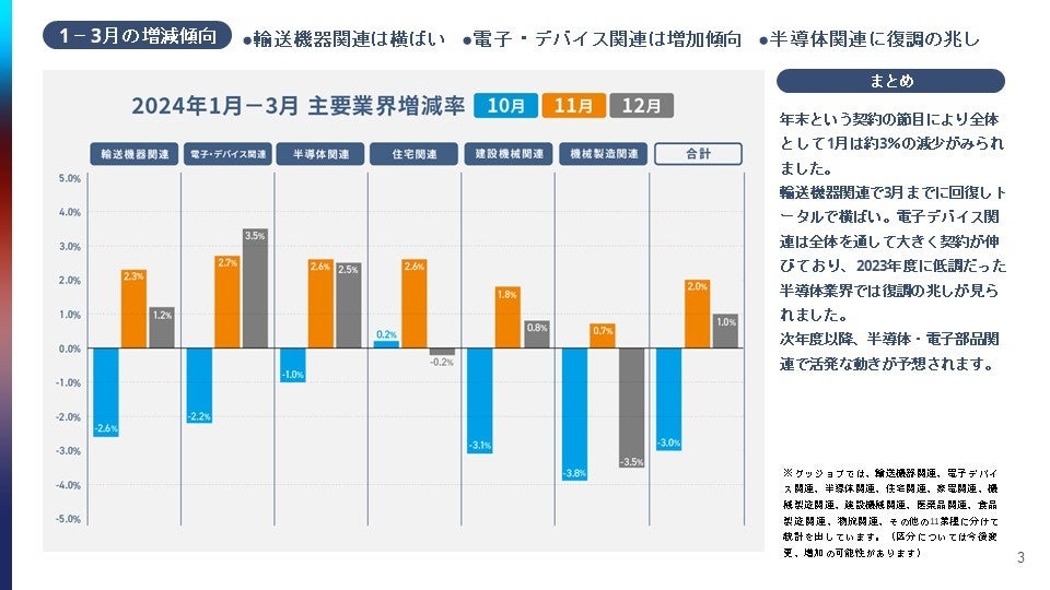 輸送機器関連で3月までに回復しトータルで横ばい。電子デバイス関連は全体を通して大きく契約が伸びており、2023年度に低調だった半導体業界では復調の兆しが見られました。