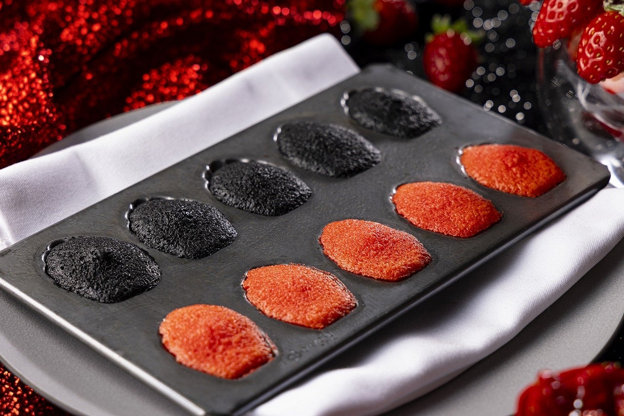 北海道産バターと竹炭を使用した2種のイチゴ味の焼きたてミニマドレーヌ10個はマスカルポーネと生クリームを合わせたクリームや甘酸っぱい自家製いちごジャムを付けて