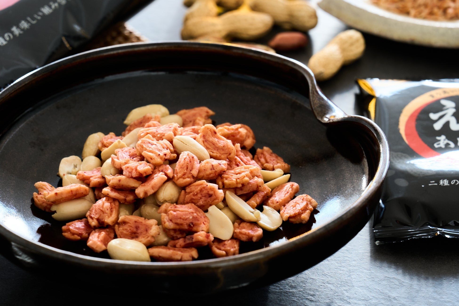 海老を練りこんで作ったえびあられと、香ばしくローストしたピーナッツを絶妙な配合でミックス