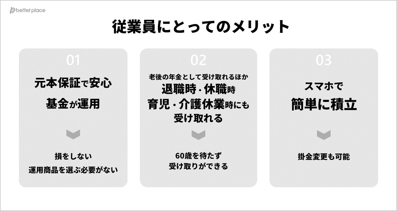 従業員側のメリットには、難しい投資の知識が不要で、元本が保証されていることがあげられます。また、原則60歳以上にならないと受け取りができない企業型DC(企業型確定拠出年金)やiDeCo(個人型確定拠出年金)に比べて、年金として受け取れるほか、退職時や休職時、育児・介護休業時にも受け取ることが可能なため、育児や介護を将来に控える従業員から厚い支持を集めています。