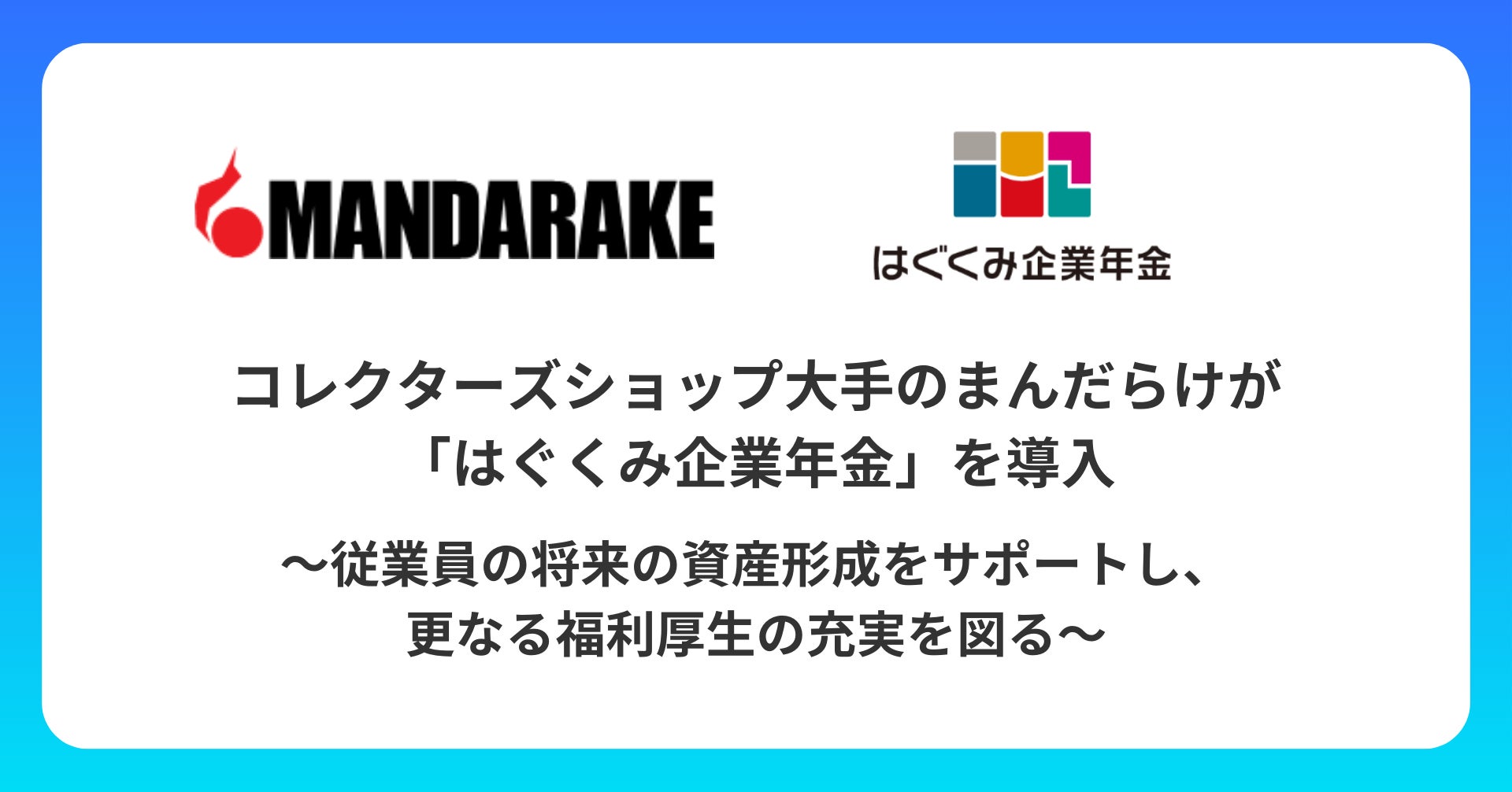 「福祉はぐくみ企業年金基金」(以下、「はぐくみ企業年金」)を中心に、企業年金・退職金制度の導入・設計をサポートする株式会社ベター・プレイス(本社:東京都新宿区、代表取締役社長:森本 新士、https://bpcom.jp/、以下、ベター・プレイス)は、漫画・アニメ・玩具の大手コレクターズショップ、株式会社まんだらけ(東証スタンダード:2652、本社:東京都中野区、代表取締役社長:田中 幹教、以下、まんだらけ)が、「はぐくみ企業年金」を導入したことをお知らせいたします。