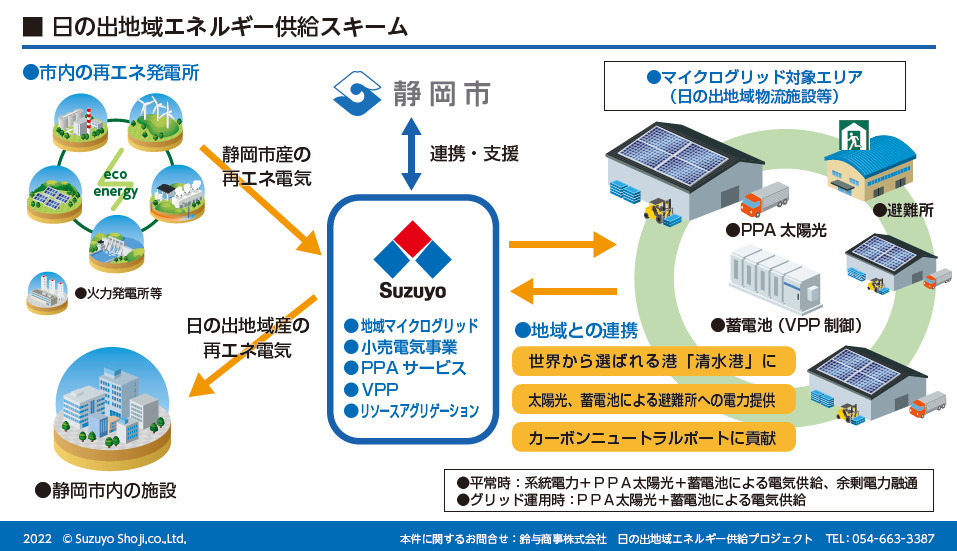 今回の取り組みは、鈴与グループの主要拠点である清水港の一角に位置する日の出地区において、居並ぶ倉庫の屋根等を最大限に活用した地域内の脱炭素化と、万が一の停電時でも事業活動等に必要な電力を確保する地域内のレジリエンス強化を、具体的な取組みの主眼に置いております。