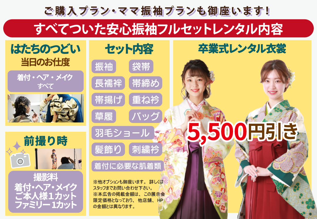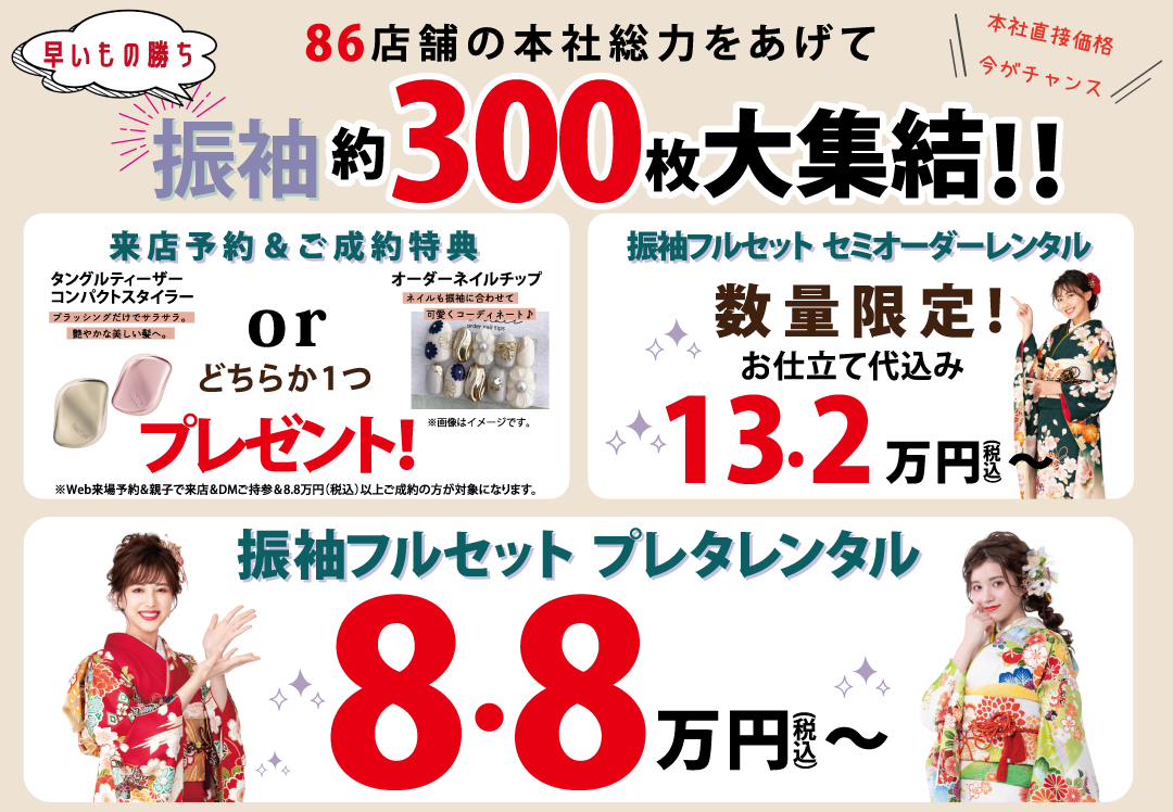 3月、5月に開催。場所は、高津区と中原区の2か所。完全予約制で来店予約特典ご用意。振袖(ふりそで)の「レンタル」or「お買い上げ」選択可。成約時の特典多数。