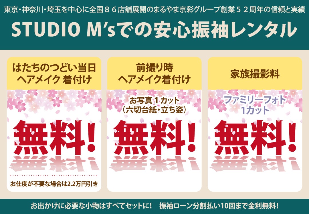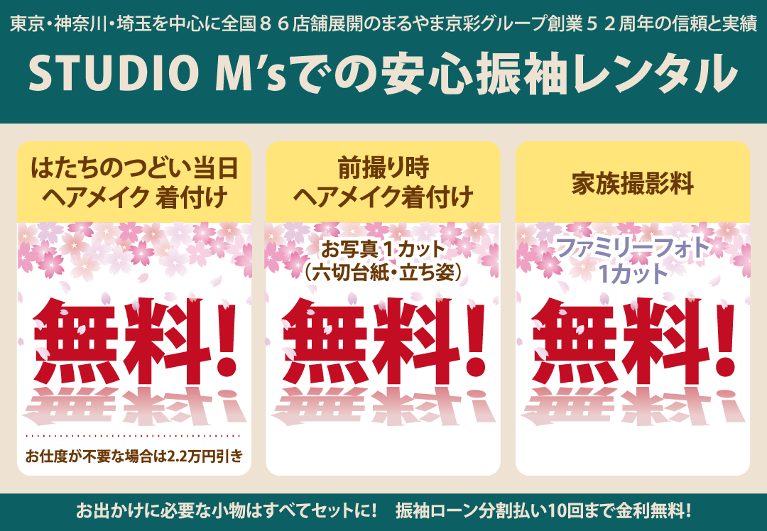 さらに、STUDIO M'sでの安心振袖レンタルでは、無料サービスも充実!