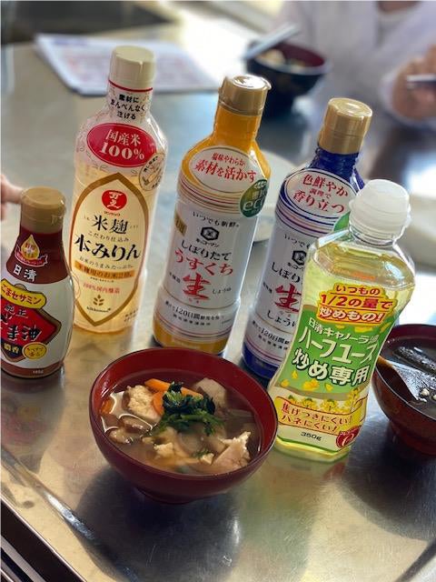 授業では、まず両社の社員が講師となり、鎌倉の郷土料理「けんちん汁」にも欠かせない、しょうゆと食用油のおいしさや健康性についてお伝えしました。続く調理実習では、鎌倉パークホテル「日本料理 和 みなもと」山口副料理長が講師を務め、プロ直伝のレシピでけんちん汁を作りました。子供たちは五感を駆使し、油で野菜を炒める際の香りの変化や、調味料による味と香りの変化、そして豆腐を手でちぎる感触を体験しました。特に、味見をしながら、しょうゆ、みりん、ごま油を入れる過程では、その変化に感嘆の声をあげながら、班ごとに相談して自分たち好みの味つけをしていました。