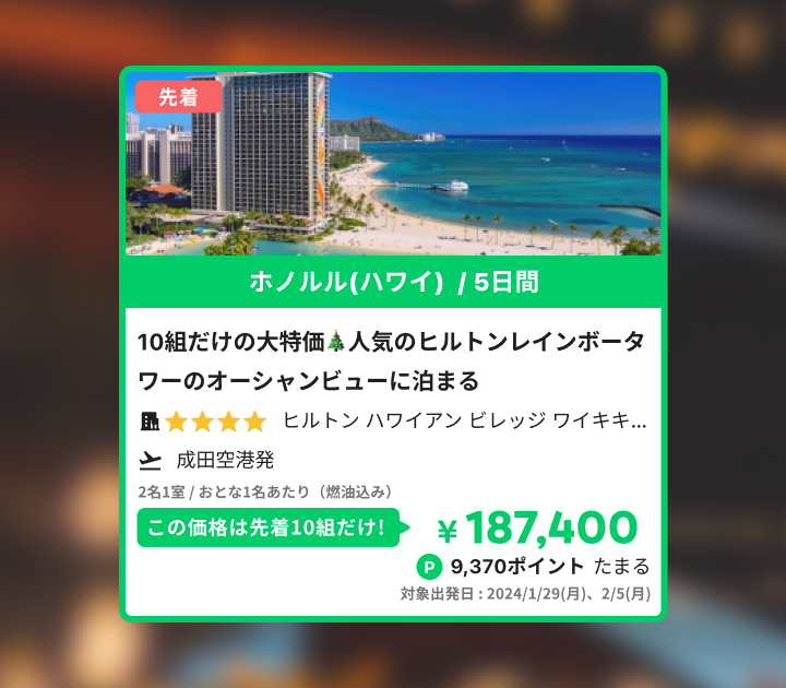 今回のセールでは、ハワイや韓国の豪華ホテルなどが100名様に当たる「海外旅行ジャンボ」開催や、先着250名限定の大特価ツアー販売など、今年最後のおトクなプレゼントをお贈りいたします。ぜひこの機会に今年最後の海外旅行の予約をご検討ください。