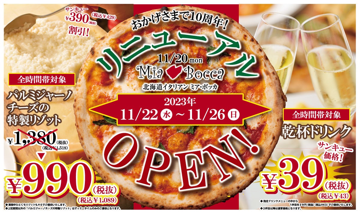 【OPEN!】北海道イタリアン ミア・ボッカ石神井公園店が10周年を記念してリニューアルOPEN!大きなチーズの上で仕上げる人気のリゾットが390円割引!乾杯ドリンクが39円!のサンキュー還元づくし!
