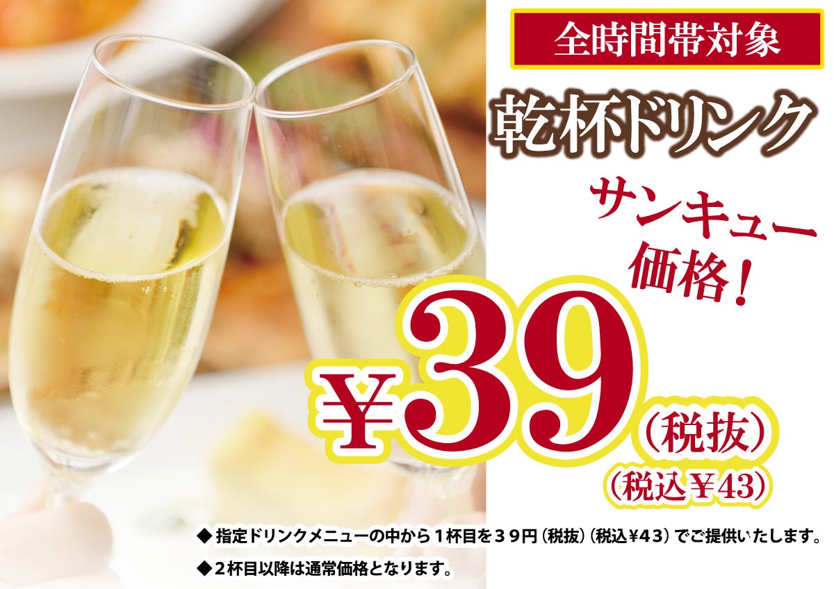 2.乾杯ドリンク 39円(税込43円)にてご提供(ランチ・ディナータイムどちらも実施!)
