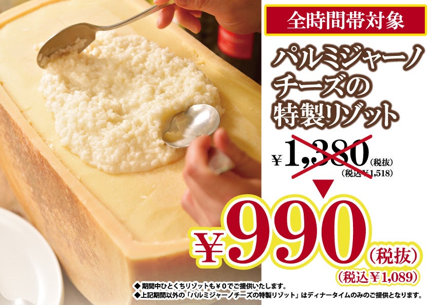 1.イタリアの王様といわれる「パルミジャーノチーズ」と北海道富良野産「ななつぼし」でつくる「パルミジャーノチーズの特製リゾット」を390円(税抜)サンキュー割引し、通常1518円→1089円(税込)。さらに通常ディナータイムのみの提供だがキャンペーン期間中はランチタイムも提供!