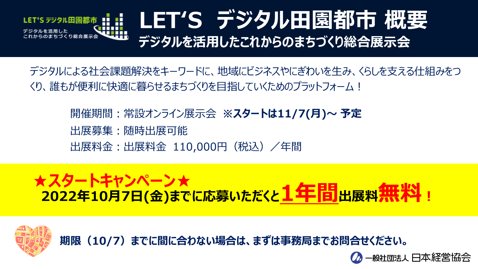 一般社団法人日本経営協会(本部事務局:東京都渋谷区、会長:高原 豪久)は、デジタルを活用したこれからのまちづくり総合展示会「LET’S デジタル田園都市」を常設オンライン展示会として開催いたします。本展示会の開催を記念して10月7日(金)までの出展申込みで1年間の出展料(11万円)が無料になるスタートキャンペーンと、総額20万円分が無料になるタイアップイベントキャンペーンを開始いたします。