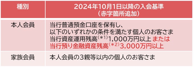 これまで「当行での資産運用残高1,000万円以上」の方としていた入会基準を、2024年10月1日から「当行預かり資産残高3,000万円以上」の方も入会できるように拡大します。これにより、より多くのお客さまにサービスをお届けしていきます。