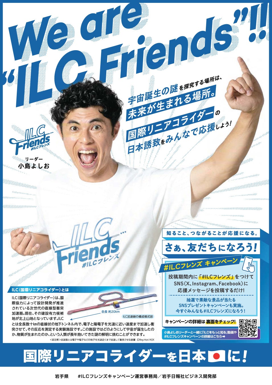 ILCフレンズのリーダーには小島よしおさんが就任し、Youtubeでの解説動画の公開や、#投稿によるプレゼント等、SNSを中心に、ILCフレンズの輪を広げる取組を行っています。