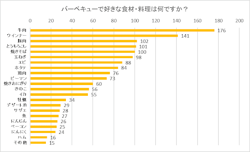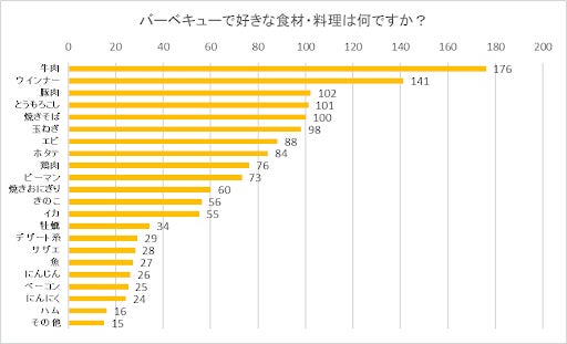 「バーベキューで好きな食材・料理は何ですか?」という質問では、1位が「牛肉」で176票を集め、続いて2位が「ウインナー」で141票、3位が「豚肉」で102票という結果でした。