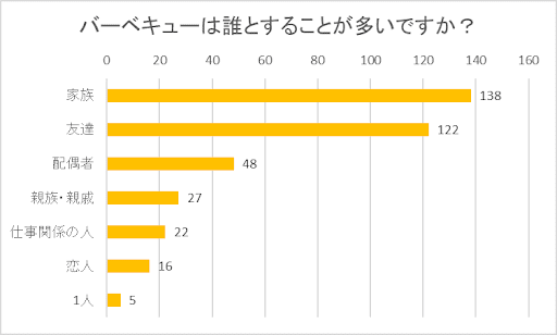 「バーベキューは誰とすることが多いですか?」という質問では、「家族」が138票を集め、続いて「友達」が122票、「配偶者」が48票という結果でした。
