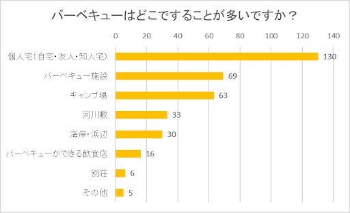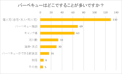 「バーベキューはどこですることが多いですか?」という質問では、「個人宅(自宅・友人・知人宅)」が130票を集め、続いて「バーベキュー施設」が69票、「キャンプ場」が63票という結果でした。