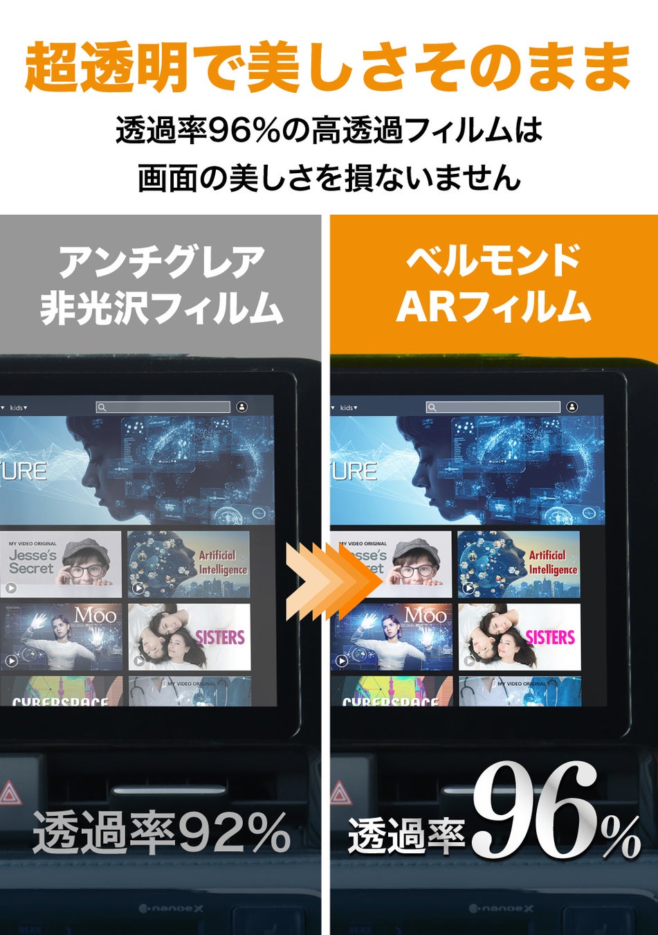 透過率96%の高透過フィルムなので、画面の美しさを損わず、鮮やかな画面のまま映像を楽しめます。